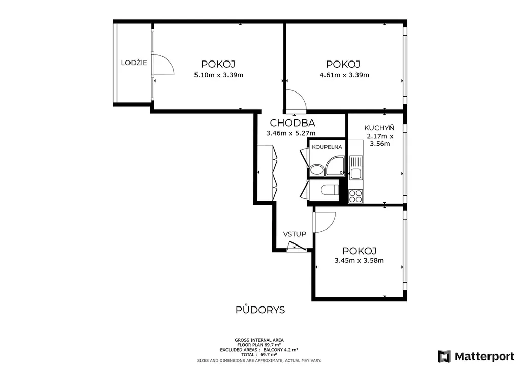 Plocha 73 m2, z toho 2,70 m2 sklep, 3,60 m2 balkon.