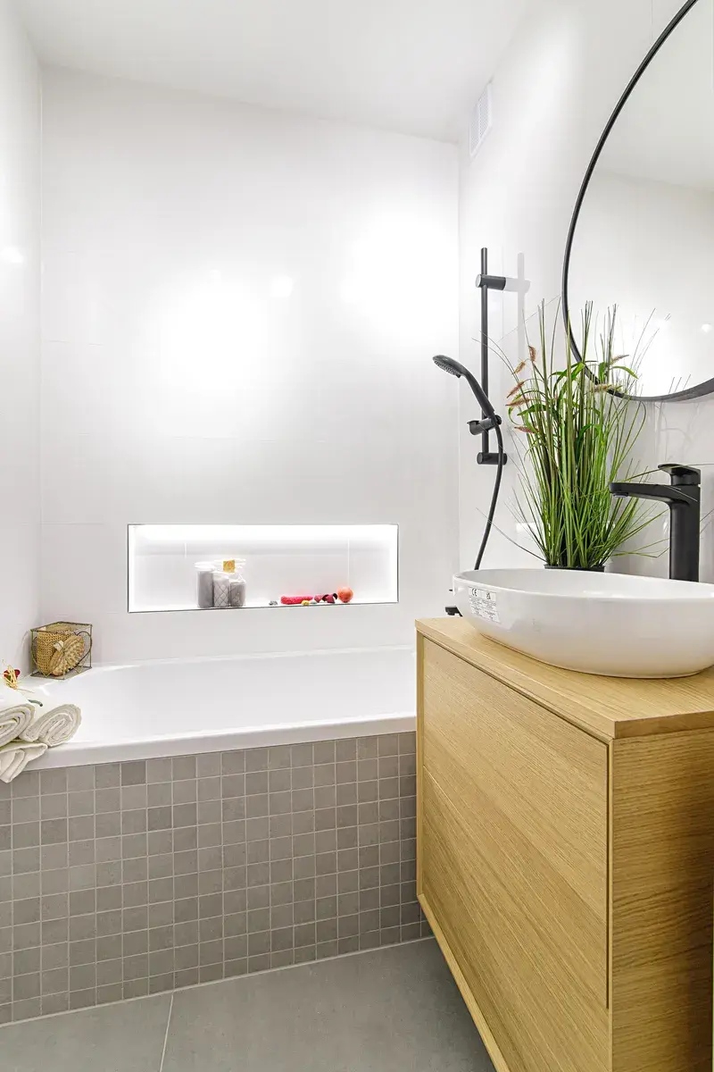 Zděná koupelna s obklady a dlažbou, které k sobě ladí, nová sanita.