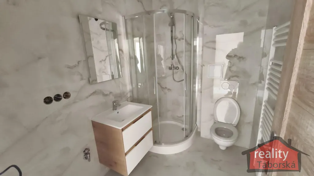 V koupelně je sprchový kout, umyvadlo se skříňkou, osvětlené zrcadlo, topné těleso, toaleta a prostor na pračku s připravenými vývody na vodu a odpad.