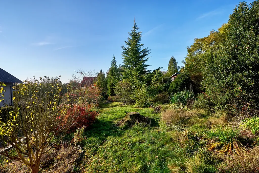 V krásné rozlehlé zahradě je altán a kůlna na nářadí.