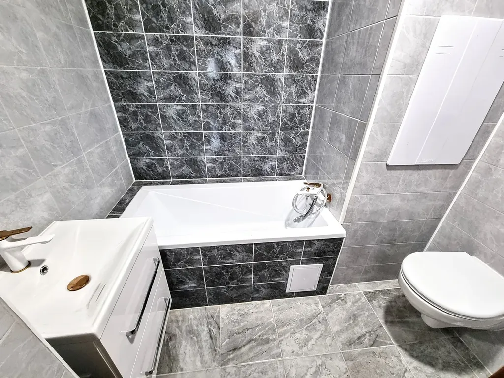 Prostorný obývák s velkými okny vám poskytne dostatek denního světla a přímý vstup na balkon s krásným výhledem do centra města – ideální místo pro odpočinout si po náročném dni či uspořádat posezení s přáteli. Byt disponuje prostornou koupelnou s vanou, umyvadlem se zrcadlem a toaletou, vše moderně vybavené a pečlivě zrekonstruované.