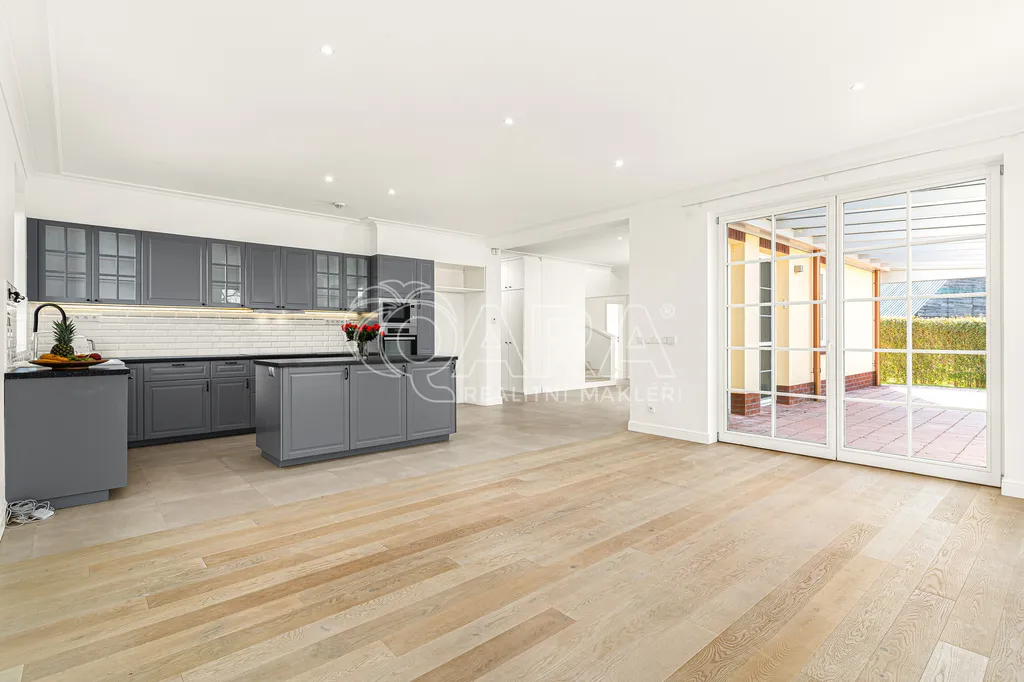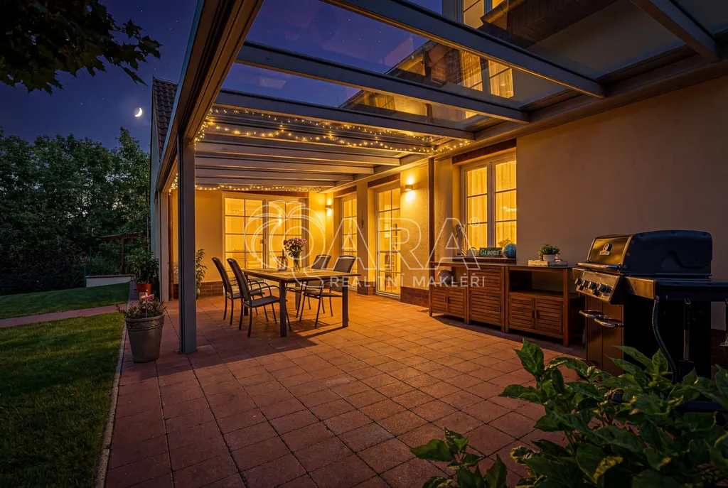 Z obývací části je přímý vstup na terasu s pergolou, která nabízí ideální prostor pro odpočinek i setkání s rodinou a přáteli.