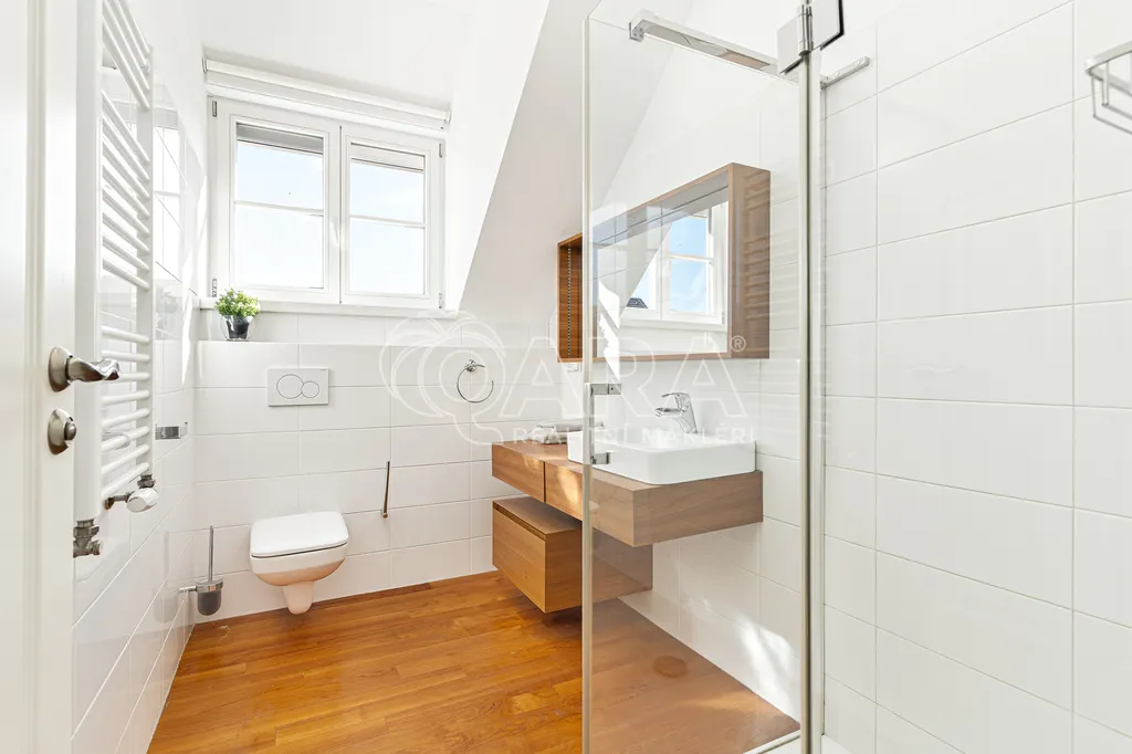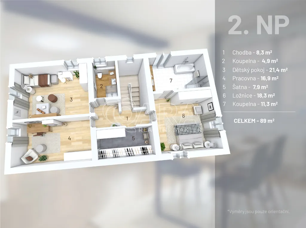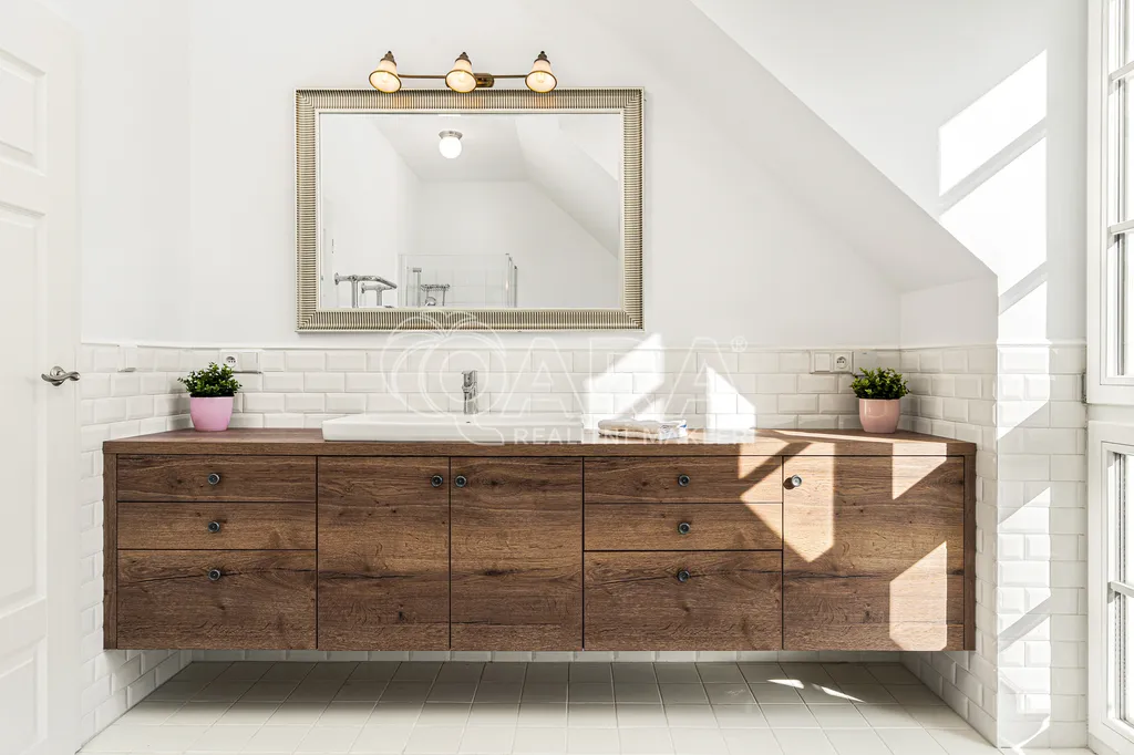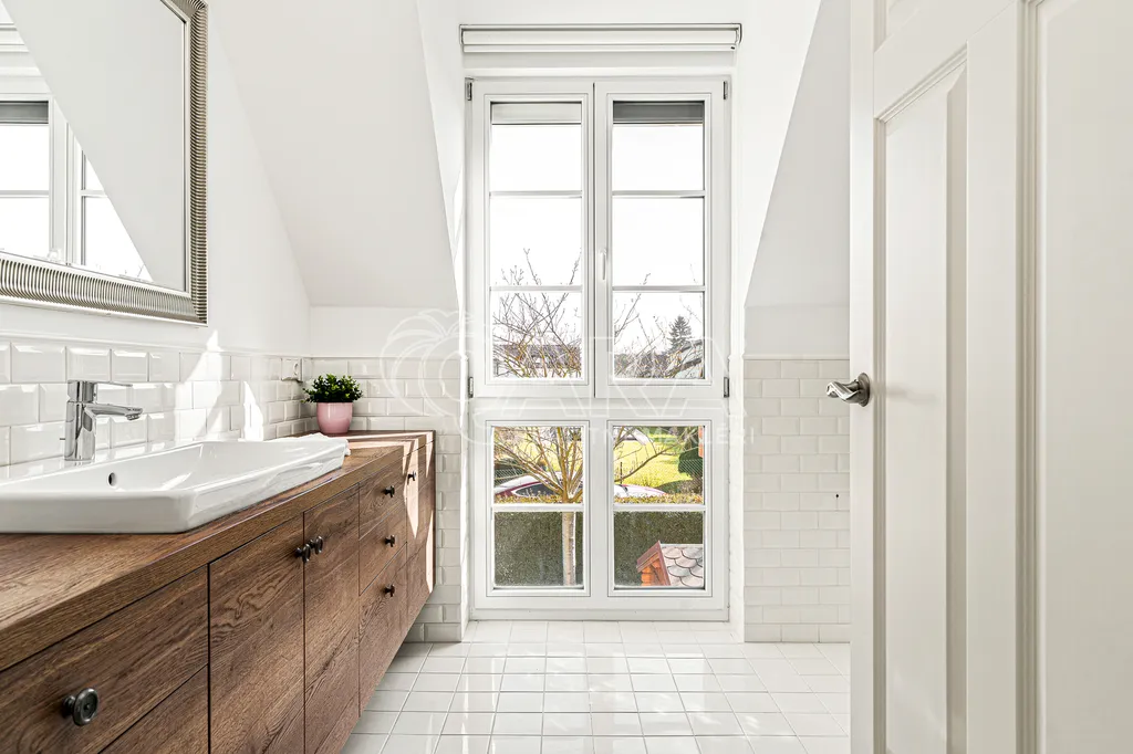 Dispozice domu nabízí několik pokojů, tři koupelny, šatnu i praktické technické zázemí. Součástí je také garáž a samostatný prostor vhodný například pro pracovnu nebo podnikání.