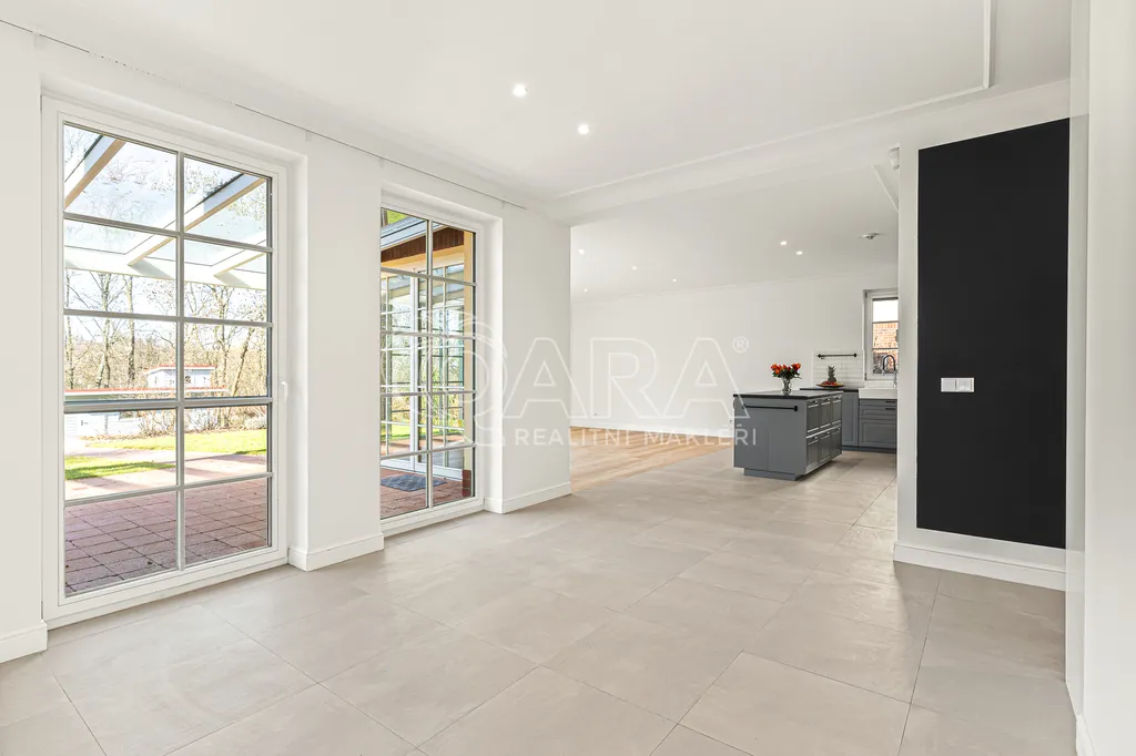 Dům působí světlým a vzdušným dojmem. Hlavní obytný prostor propojuje obývací pokoj s kuchyní a vytváří přirozené místo pro každodenní rodinný život. Velká okna přivádějí do interiéru dostatek světla a zároveň otevírají výhled do zahrady.