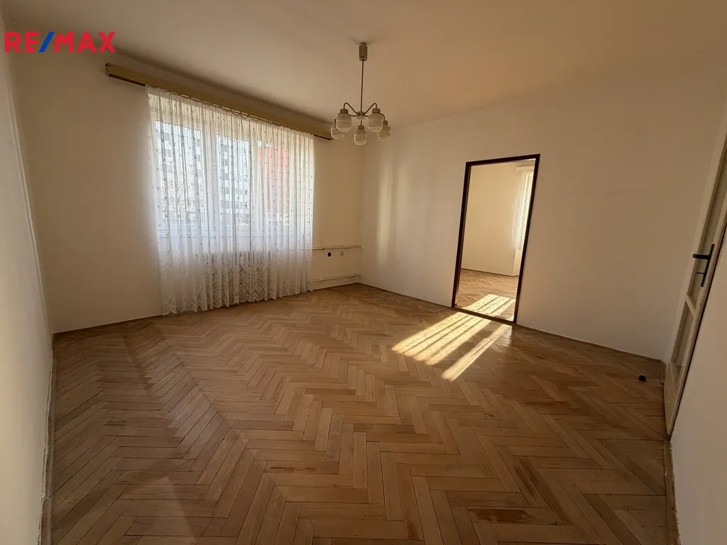 Dispozice bytu je přehledná – po vstupu se vchází do prostorné předsíně, ze které je samostatný vstup do kuchyně, koupelny, WC a hlavního pokoje. Z něj se dále prochází do druhého pokoje, který je dispozičně řešen jako navazující, ale zároveň oddělený prostor. Oba pokoje jsou vybaveny zachovalými parketovými podlahami, které dodávají interiéru charakter. Byt má celkem čtyři okna, z toho dvě orientovaná na jih a dvě na západ, díky čemuž je krásně prosvětlený po celý den. Kuchyň je dostatečně prostorná a umožňuje umístění jídelního stolu, takže může sloužit i jako plnohodnotná jídelna. K bytu náleží také sklepní kóje (4 m²).
