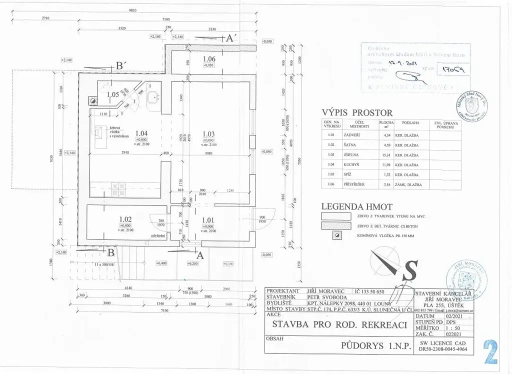 Technické informace: základy betonové, obvodové zdivo původní stavby z plných cihel, nové zdivo Ytong, obloženo dřevem. 2. NP je z dřevěné rámové montované konstrukce, podkroví pod sedlovou střechou je tvořeno krokvemi a kleštinami. Část rovné střechy na 1. NP je tvořena terasou. Podlahy 1. a 2. NP betonové, podkroví fošny. Střecha sedlová se šablonovou krytinou. Okna a dveře plastové. Zpevněné plochy ze zámkové dlažby.