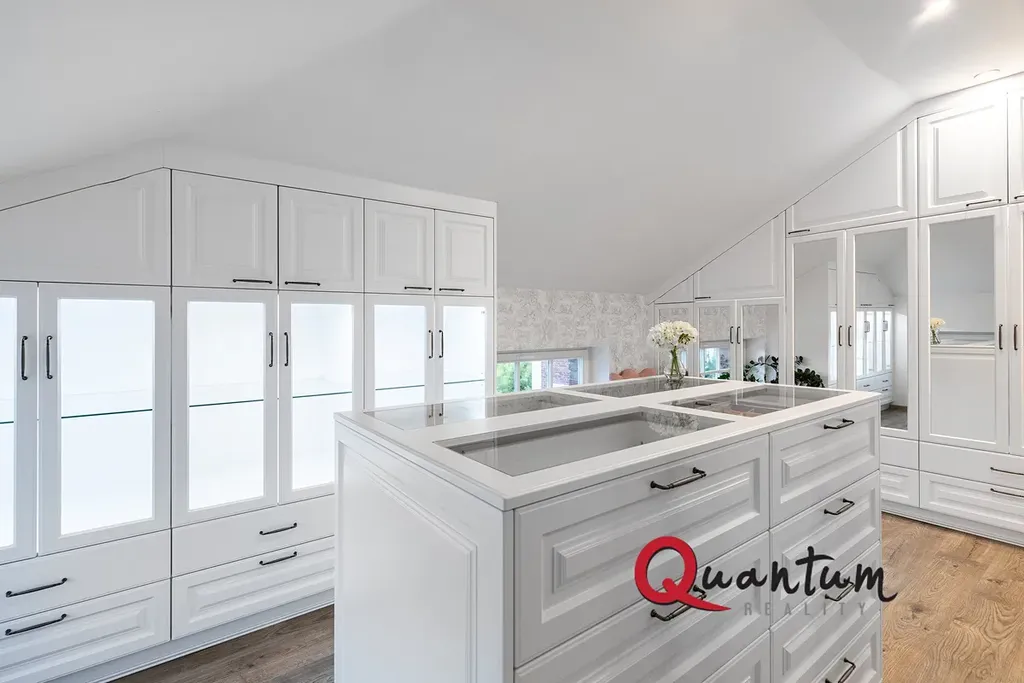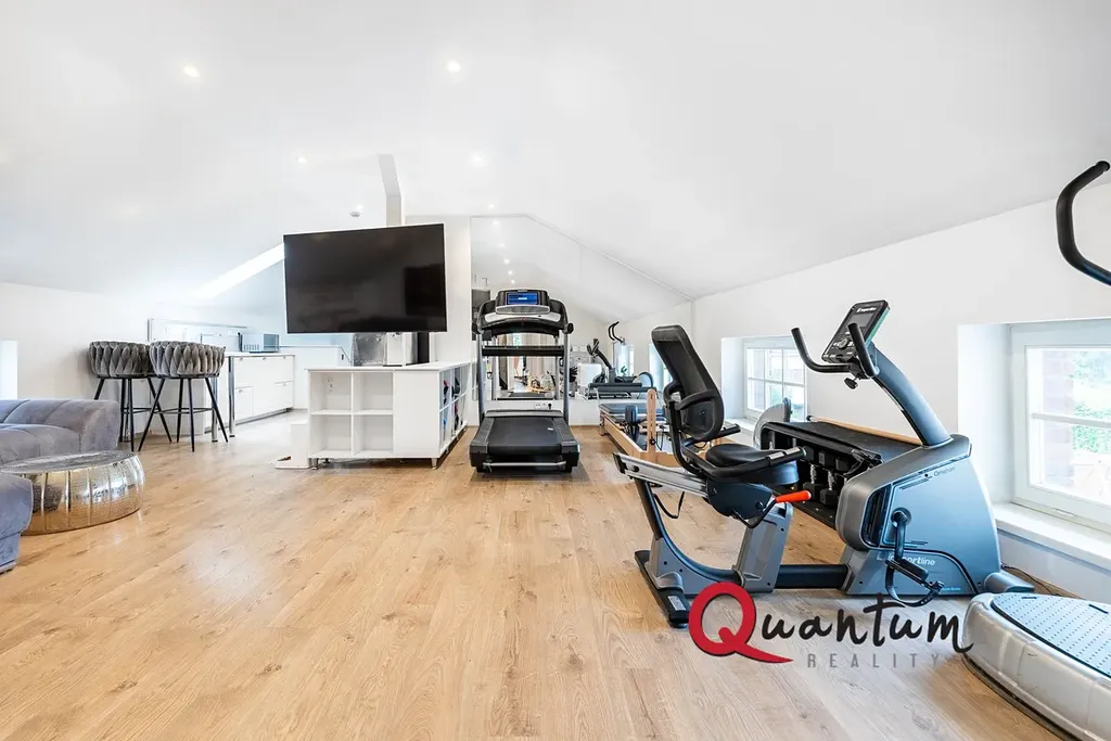 Ložnice s vlastní koupelnou, ložnice, 2x koupelna, šatna, velká podkrovní místnost s kuchyňským koutem aktuálně využívaná jako fitness (snadná možnost změny na další ložnici se šatnou a koupelnou, případně nezávislého 2KK se šatnou a koupelnou k bydlení pro hosty či rodiče apod.)