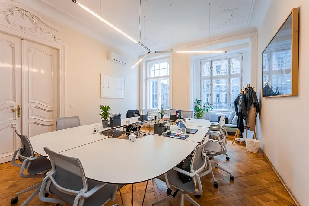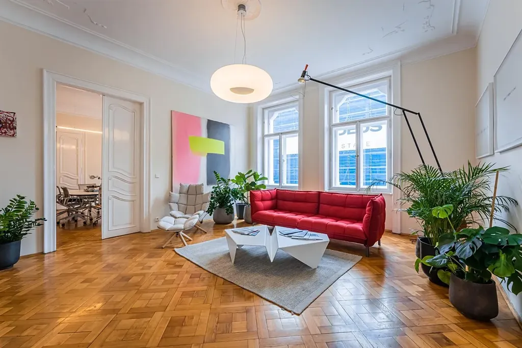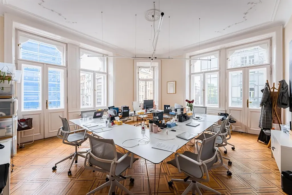 Reprezentativní kancelářské prostory 9+kk, o celkové rozloze 319 m2, se dvěma malými balkony, jsou situované ve 2. patře zrekonstruovaného secesního domu s výtahem v samotném centru města v ulici Na Perštýně, Praha 1 Staré město.
