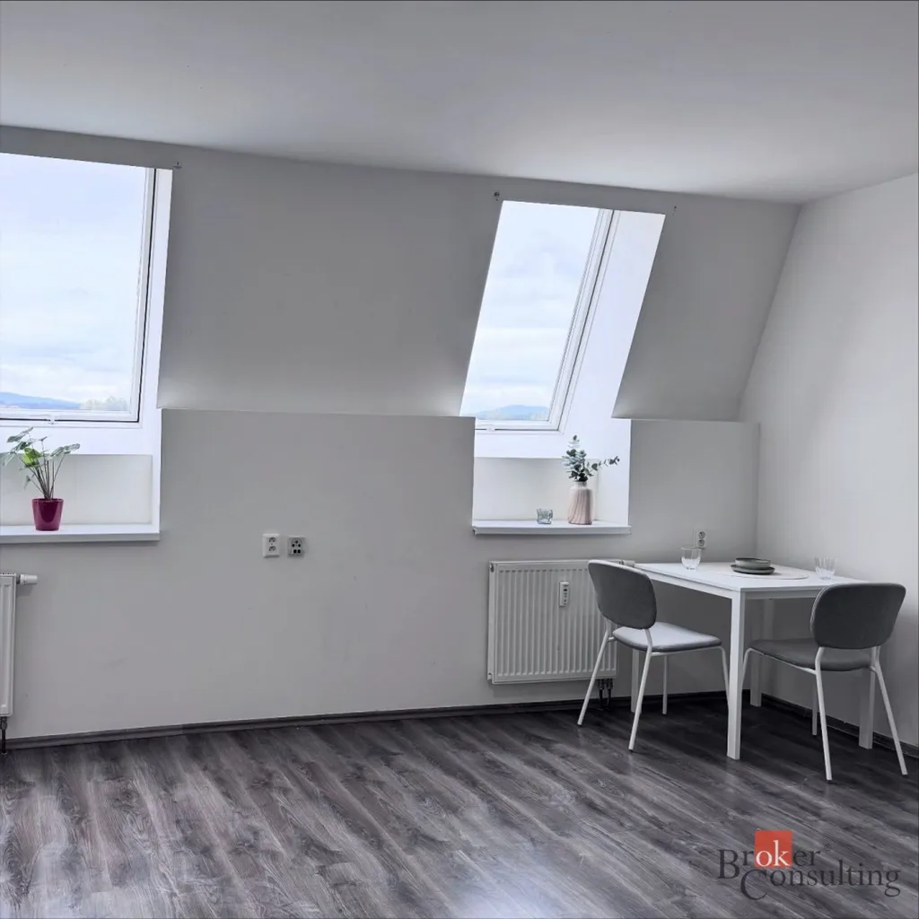 Interiér působí čistě, vzdušně a díky střešním oknům je byt příjemně prosvětlený.