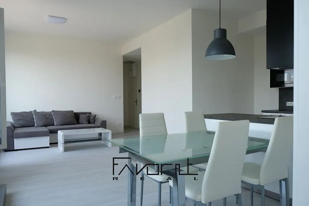 V bytě je vše nové a nepoužité (podlahy, sanita, kuchyňská linka na míru včetně el. trouby, el. varné desky, myčky a digestoře).