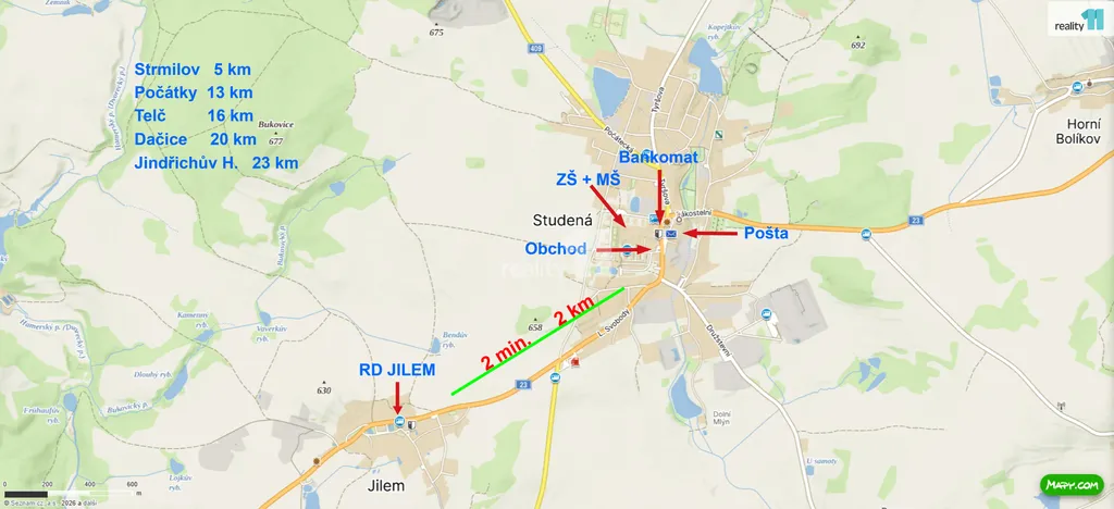 Velkou předností je kombinace klidné lokality a dobré dostupnosti. Základní občanská vybavenost je do 2 km, větší města jako Dačice, Telč nebo Jindřichův Hradec jsou v pohodlné dojezdové vzdálenosti a nabízejí kompletní služby i pracovní příležitosti. Získáváte tak to nejlepší z obou světů.