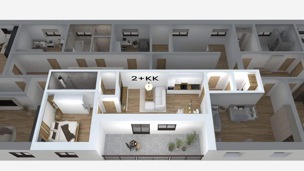 Projekt půjde do výstavby v roce 2026 a bude dokončen a zkolaudován na konci 1. pololetí 2027. V domě budou vybudovány ještě jednotky o dispozici 4+kk (117 m2) a 3+kk (90 m2) (rovněž naleznete v inzerci).