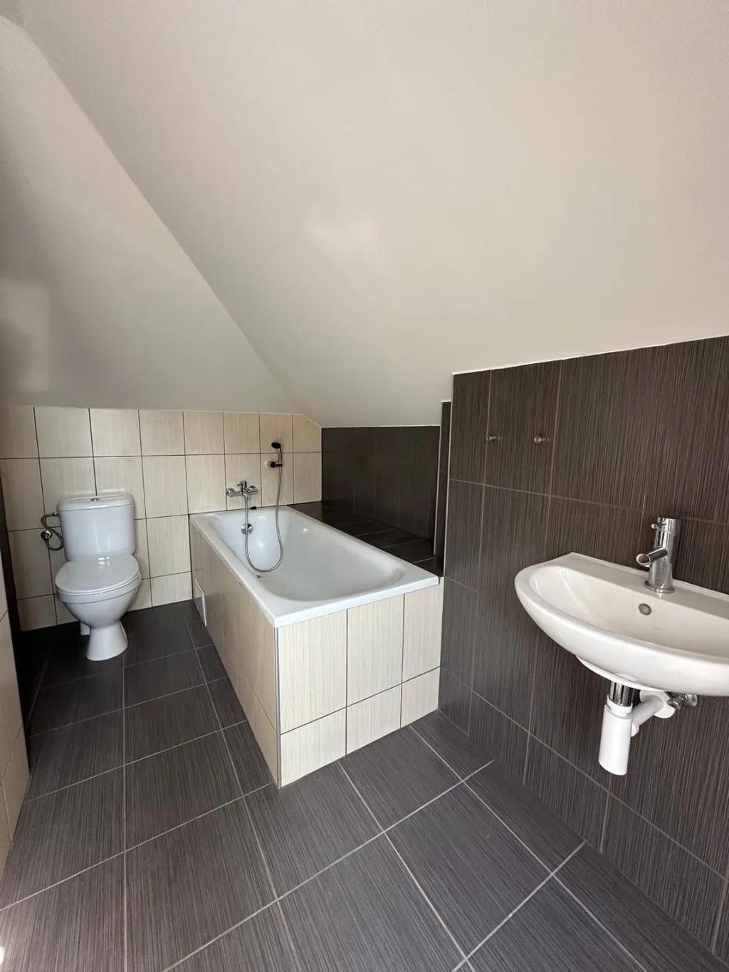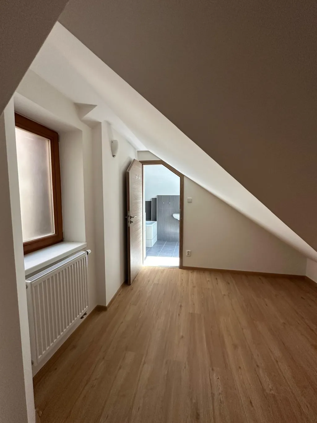 Po schodišti se dostanete do podkrovního patra, kde se nachází ložnice, druhá koupelna s vanou a toaletou a také volný prostor, ideální například jako šatna či pracovní kout.