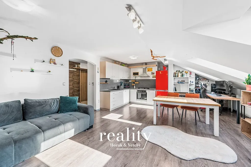 Dominantou bytu je prostorný obývací pokoj s kuchyňským koutem, který díky třem střešním oknům orientovaným na jihovýchod působí velmi vzdušně a světlým dojmem. Kuchyňská linka je vybavena kombinovaným sporákem (plynová varná deska + elektrická trouba).