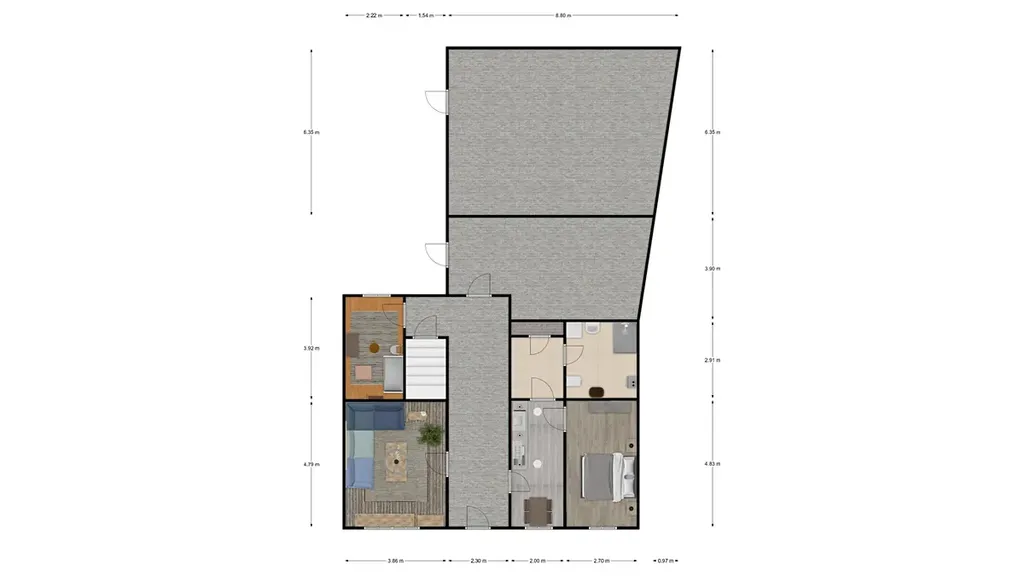 Středem domu vede chodba, kterou se vzchází do zahrady přes navazující prostor dílny. Po levé straně se nachází obývací pokoj a na konci chodby malá ložnice. Po pravé straně vstup do kuchyně a následně koupelny a druhé větší ložnice.