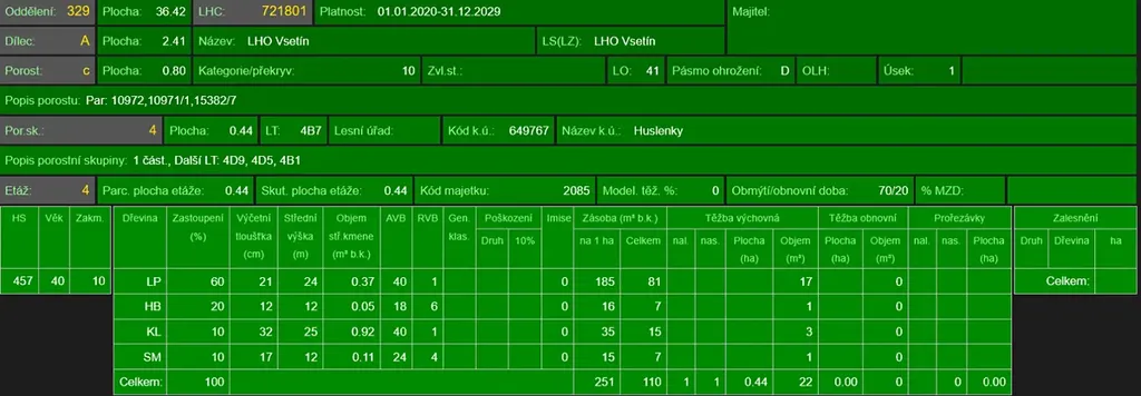 - p.č. 10972 vedená jako lesní pozemek o celkové výměře 1 601 m2 (stáří lesa 96 let - zastoupení dřevin habr, lípa, buk, stáří lesa 46 let - zastoupení dřevin lípa, habr, javor, smrk),