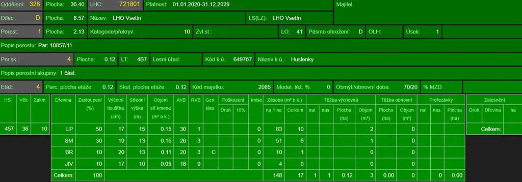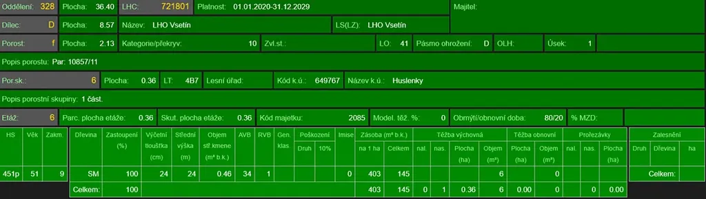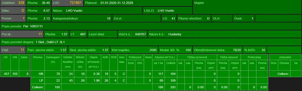 - p.č. 10857/11 vedená jako lesní pozemek o celkové výměře 21 297 m2, (stáří lesa 111 let - zastoupení dřevin habr, lípa, stáří lesa 57 let - zastoupení dřevin smrk, stáří lesa 42 let - zastoupení dřevin lípa, smrk, bříza, vrba),