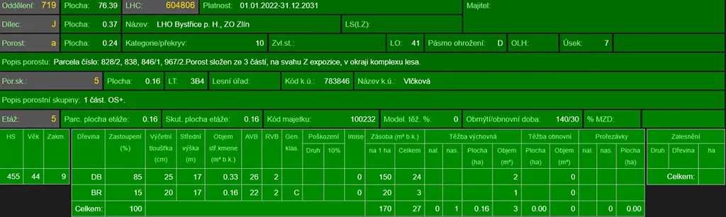 - p.č. 2158 vedená jako lesní pozemek o celkové výměře 3 331 m2 (stáří lesa 48 let - zastoupení dřevin dub, bříza).