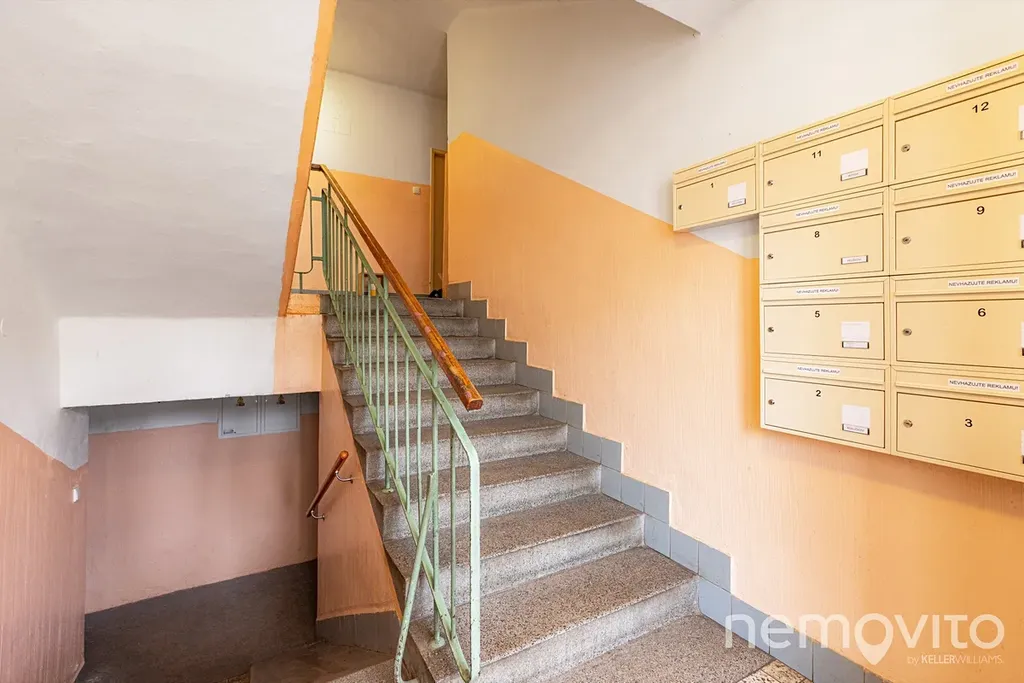 Nachází se ve třetím podlaží bez výtahu a k dispozici je částečně zařízený. Byt prošel v roce 2012 rekonstrukcí, která obnášela nové rozvody elektřiny, novou koupelnu, přesun kuchyně z chodby do hlavní místnosti a renovaci původních dřevěných parket. Hlavní místnost má pravidelný půdorys 4x5 metrů a díky velkému oknu i vyšším stropům (2,7 m) působí příjemně.