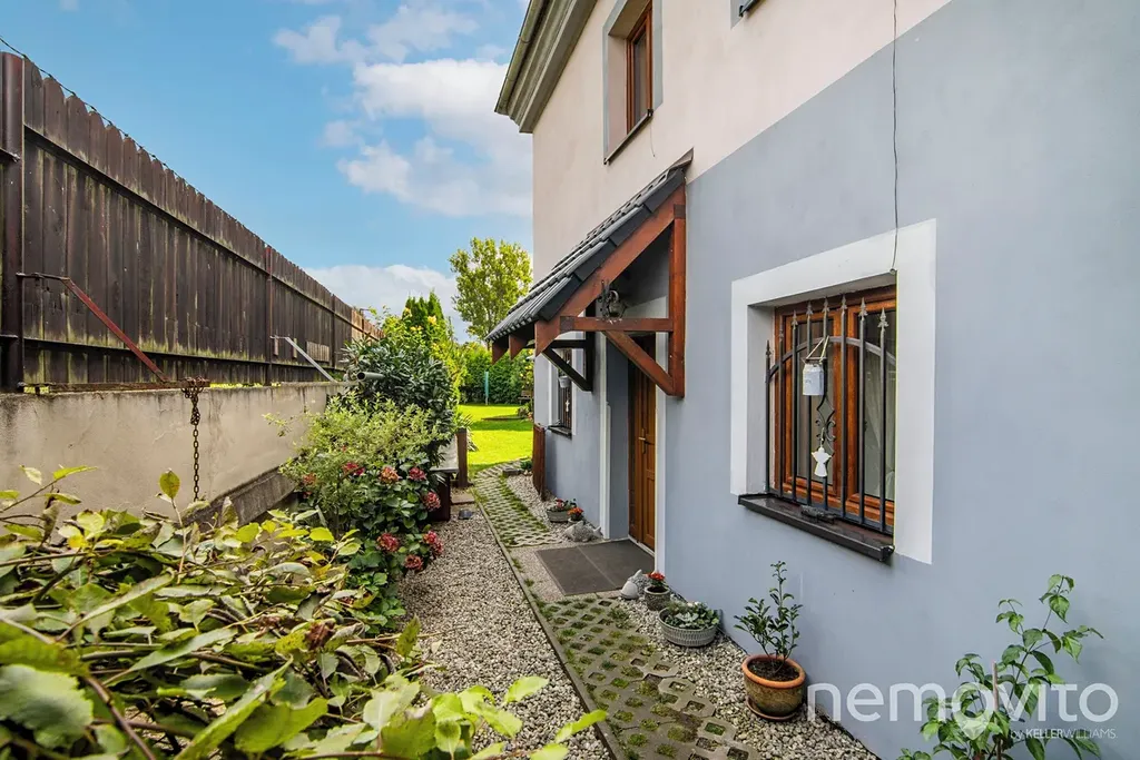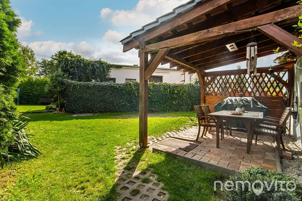 Na dům navazuje dřevěná pergola, ideální pro letní posezení. V zadní části zahrady se nachází zahradní domek využitelný jako sklad zahradního náčiní nebo sezónního vybavení.