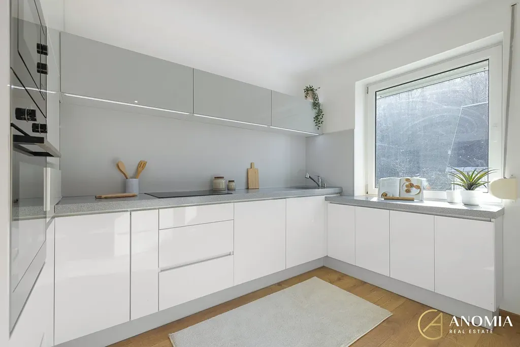 Dominantou domu je velkorysý obývací prostor s galerií, vysokými stropy a velkými okny, díky nimž je interiér krásně prosvětlený a působí velmi vzdušně. Na obývací část přirozeně navazuje kuchyně s jídelním koutem. Moderní kuchyňská linka je vybavena všemi spotřebiči a nabízí dostatek pracovního i úložného prostoru.