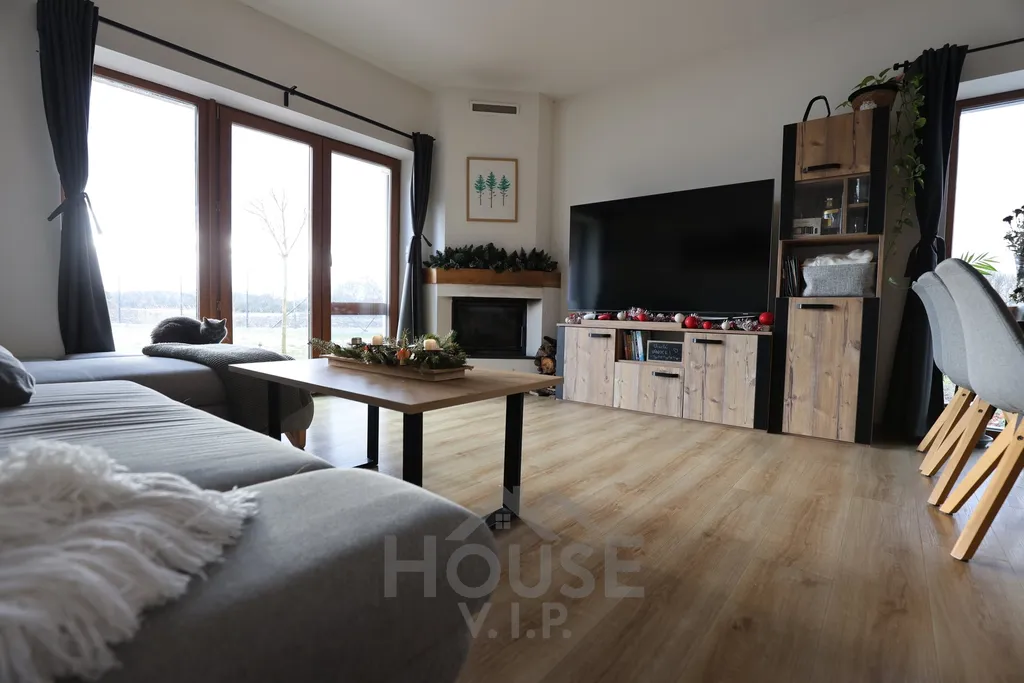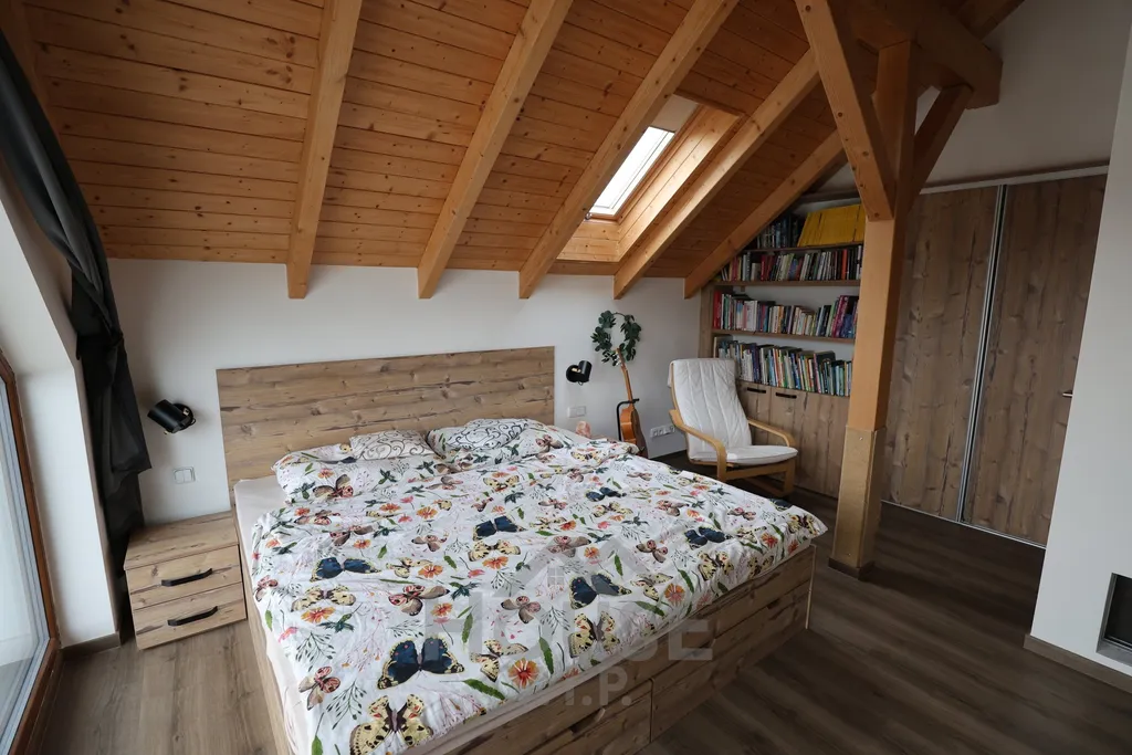 Interiér domu je laděn do teplých přírodních odstínů dřeva a působí velmi útulně. Většina nábytku byla vyrobena truhlářem na míru a je součástí prodejní ceny. Užitná plocha domu činí přibližně 132 m², dispozice je 6+kk. Dům je energeticky úsporný (PENB třídy B) s nízkými provozními náklady a je vybaven zabezpečovacím systémem Jablotron.