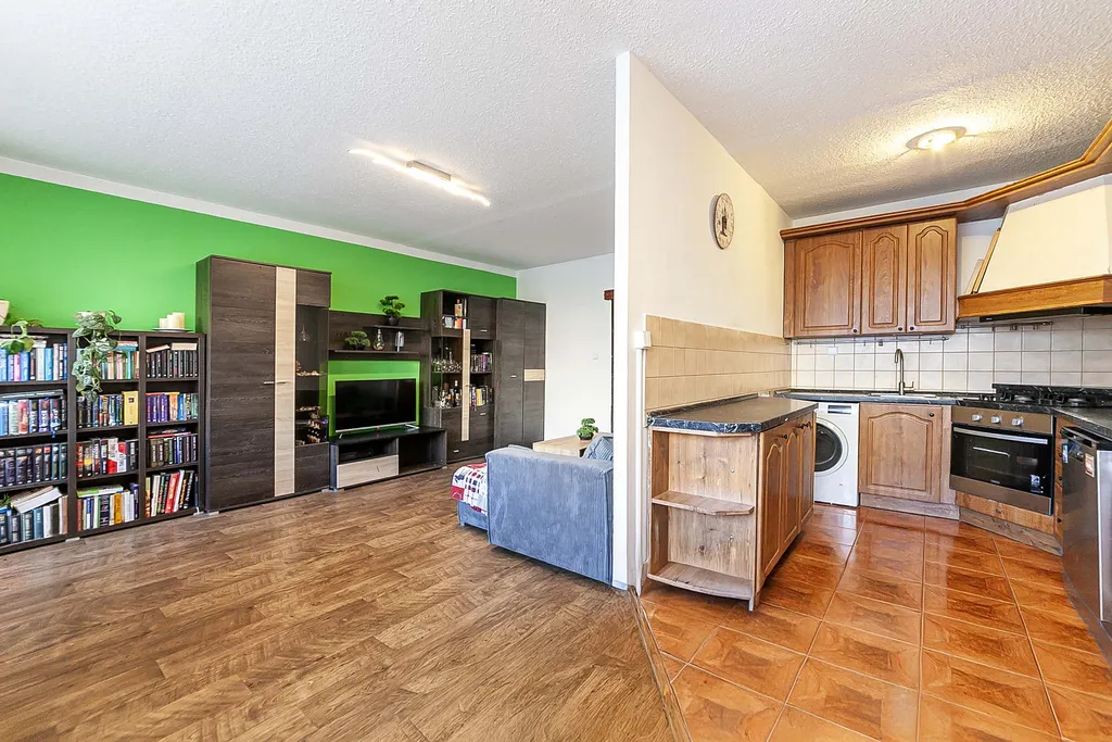 • Velkorysý obývací pokoj částečně propojený s kuchyní vytváří příjemné centrum domova a vstup do lodžie.