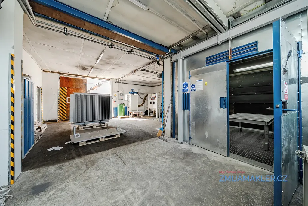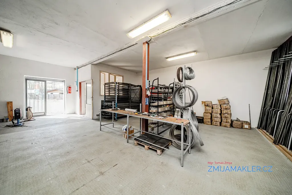 Součástí pozemku je hala o velikosti 641 m2 s kanceláří, prodejnou a dalšími devíti samostatnými dílnami. Dílny mají svůj samostatný vjezd či vchod na obě strany budovy. Budova je zděná, opatřená brizolitovou omítkou, základy budovy jsou provedeny z betonových základových pásů, střecha budovy je sedlová, pokrytá vlnitým plechem. Okna a dveře/vrata v jednotlivých místnostech jsou kovová, místy jsou okna vybavena luxvery. Vnitřní povrch zdí dílen je vyhotoven z vápenné omístky. Elektroinstalace v budově je třífázová, světelná. Vytápění v hlavní dílně je zajištěno kotlem na pevná paliva. V budově je možno obnovit původní připojení k plynu a zajistit tak vytápění objektu plynovým kotlem. Přívod vody, WC a odpady v budově instalovány nejsou, je možné se napojit na nedaleký vodovodní řád s pitnou vodou. K dispozici je hloubkový vrt 33 m s užitkovou vodou vedle budovy. Některé části budovy jsou nyní v pronájmu, po dohodě lze ve stávajících pronájmech pokračovat. Areál je možno si pořídit samostatně bez vybavení nebo i s vybavením. Termín prohlídky si domluvte s makléřem.