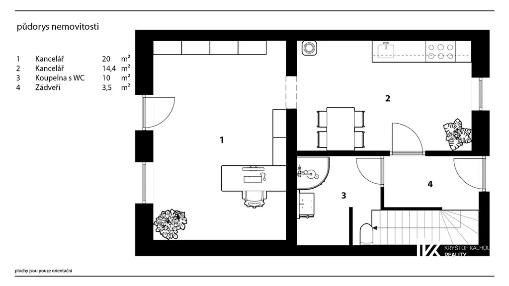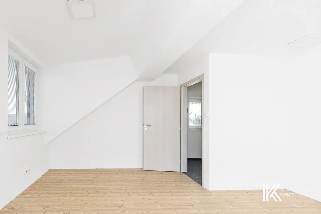 Hlavní budova má také druhý, zadní vstup ze dvora, vhodný zejména pro zaměstnance pro vstup rovnou do zázemí či horního patra. Po schodišti se dostanete do druhého podlaží, kde se nacházejí dvě samostatné místnosti vhodné jako kanceláře, jednací místnosti nebo další obchodní prostory. Dispozice patra umožňuje oddělené fungování jednotlivých částí firmy, případně kombinaci administrativy a obchodního provozu. Díky umístění nad prodejnou působí patro klidněji a je vhodné pro práci, která vyžaduje soustředění.