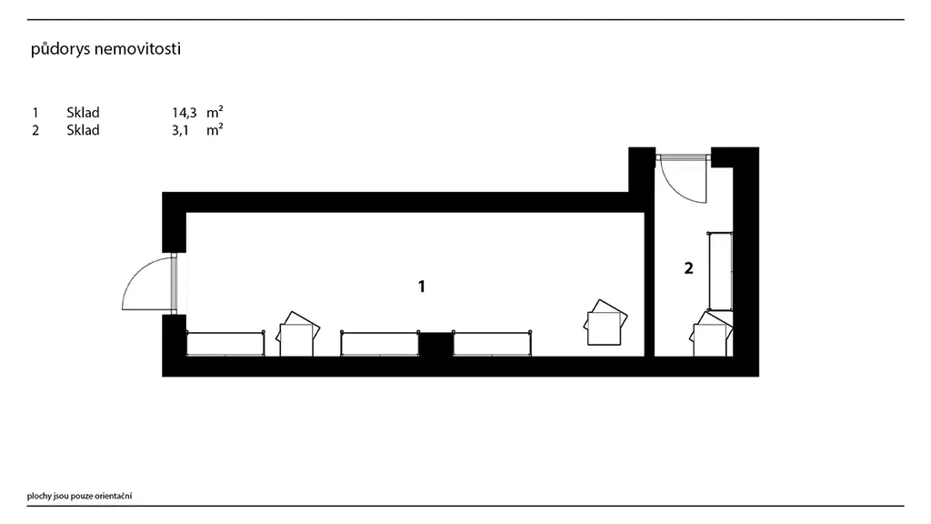 Druhou stavbu ve dvoře tvoří samostatná vydlážděná místnost, vhodná jako dílna, sklad, montážní místnost nebo jednoduchá výroba, případně jako technické zázemí firmy. Výhodou je samostatné umístění ve dvoře, které umožňuje provoz bez rušení hlavní části objektu.
