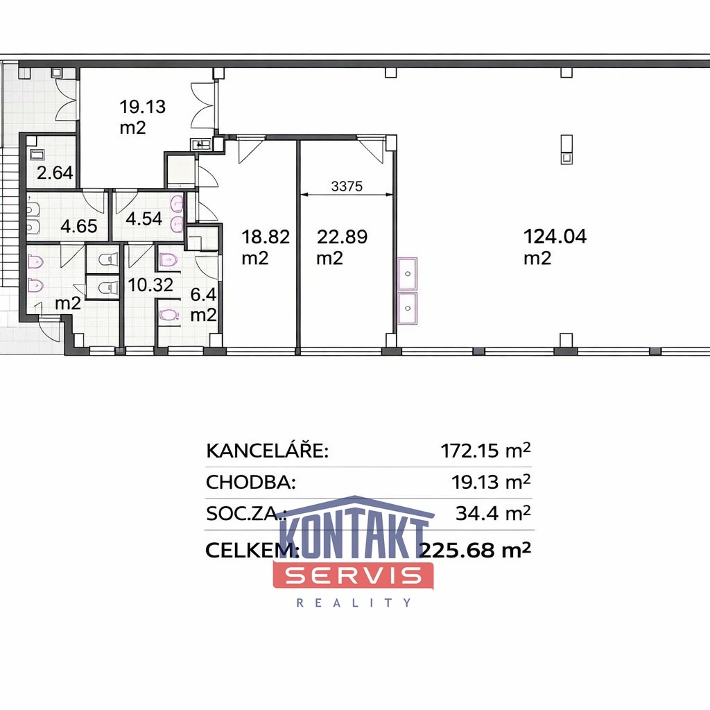 3 kancelářské místnosti o výměrách 18,82 m², 22,89 m² a 124,04 m² (celkem 172,15 m²)