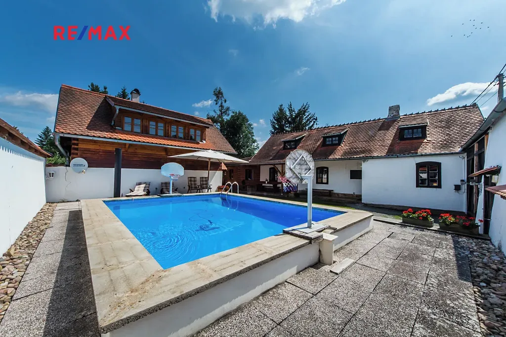 Tato nemovitost se nachází na pozemku s dalším domem. V létě lze společně využívat bazén a s tím se váže povinnost podílet se na nákladech za provoz.