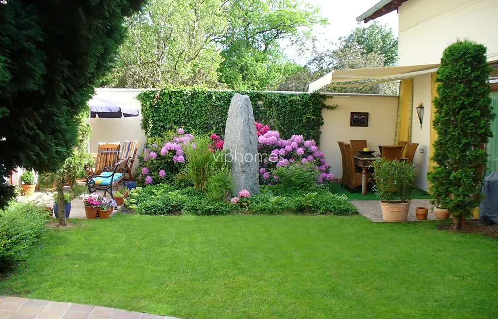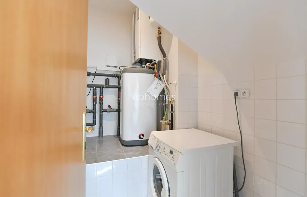 V přízemí bytu se nachází společenská část bytu, kuchyň otevřená do obývacího pokoje (49 m2) se vstupy na terasu a zahrádku, WC, šatna, komora a technická místnost. Klidová zóna v patře nabízí hlavní ložnici, velkou koupelnu s vanou, sprchou a WC, další dvě ložnice, galerii a úklidovou místnost.