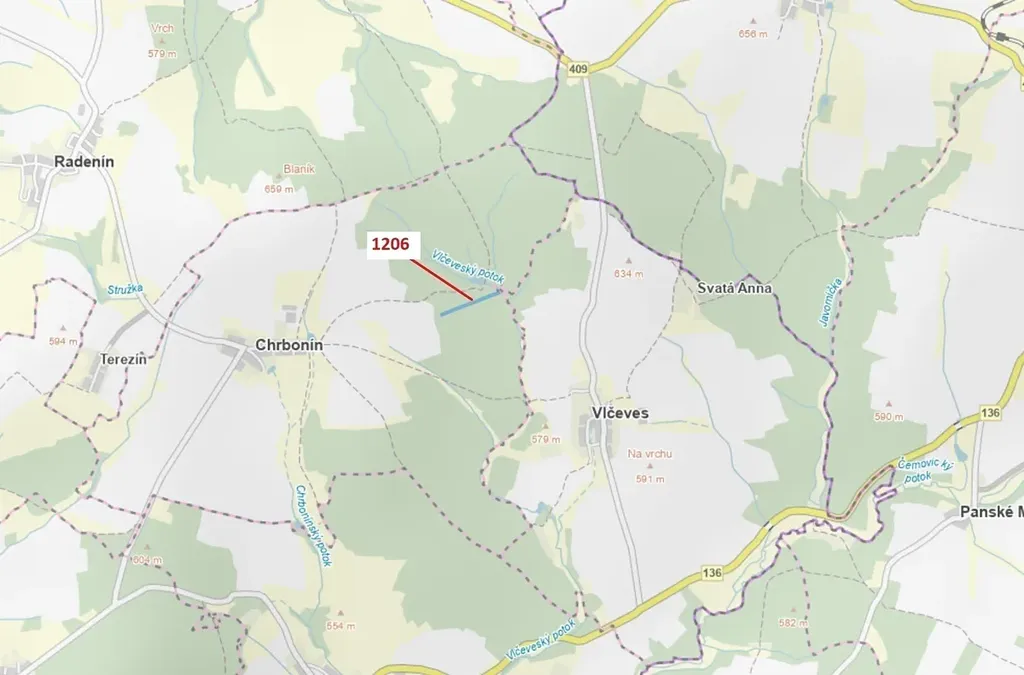 Lesní pozemek o výměře 10 189 m2, parcelní číslo 1206, podíl 1/1, katastrální území Chrbonín, obec Chrbonín, obec s rozšířenou působností Tábor, okres Tábor, Jihočeský kraj. Částečně po těžbě.