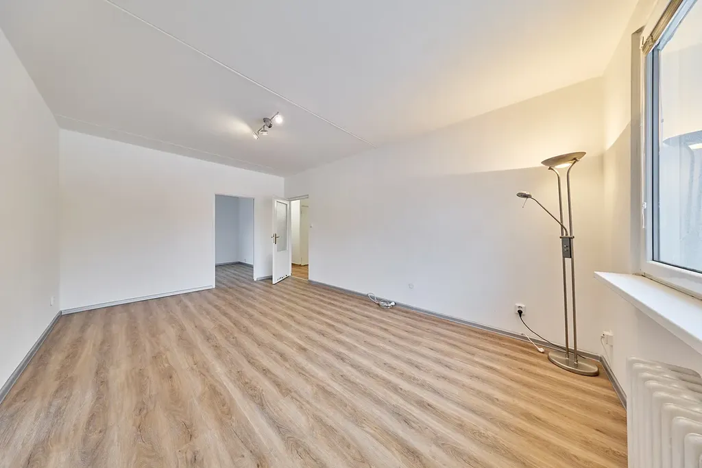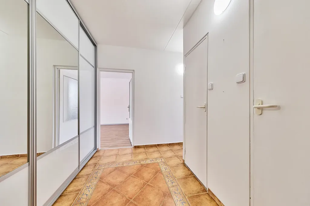 Dispozice: prostorná vstupní předsíň s velkou vestavěnou skříní (8,6m2), po pravé straně koupelna s vanou (2,6 m2) a samostatné WC (0,93 m2). Dále kuchyň s jídelním koutem (11,55 m2) a vstup do menšího pokoje (8,1 m2). Z předsíně je vstup do obývacího pokoje (18,4 m2) a do ložnice (10,4 m2). Byt má k dispozici sklep v suterénu domu a je zde možnost užívání uzamykatelného balkonu v mezipatře.