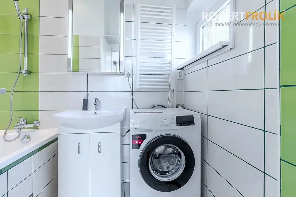 V bytě zůstane vše, co vidíte na fotografiích. Kuchyně s vestavěnou el. troubou, plynovým vařičem a cirkulační digestoří, lednice, nová pračka, nábytek. Jen matrace si musíte pořídit vlastní. Vstupní dveře bytu jsou bezpečnostní, nad částí vstupní chodby je úložný prostor. Další najdete v rohu ložnice a pod postelí. I WC (stejně jako koupelna) má větrání do světlíku. Internet můžete mít od Pe3ny net.