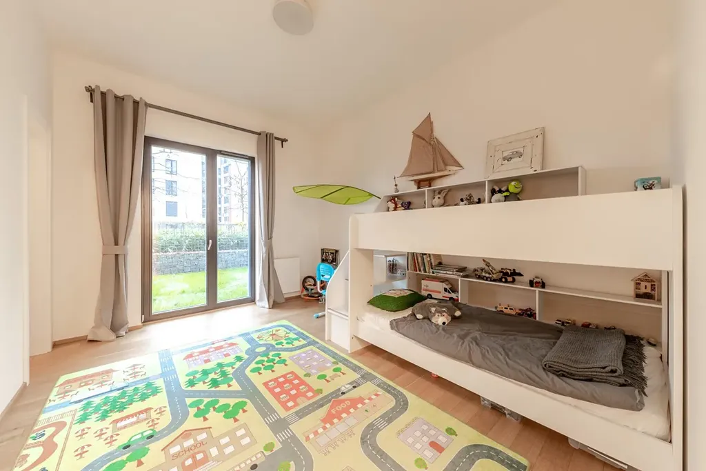 Zařízený byt se nachází v 1. nadzemním podlaží v novostavbě. Výška stropu je 3 metry. Interiér bytu tvoří obývací pokoj o velikosti 65 m2, hlavní ložnice o velikosti 23 m2 s šatnou a koupelnou se sprchovým koutem, pokoj pro hosty s vlastní koupelnou se sprchovým koutem, dětský pokoj s šatnou a s vlastní koupelnou se sprchovým koutem, další pokoj, koupelna s vanou, samotné WC, komora. Vstup na terasu a zahrádku je možný ze všech pokojů. Okna mají venkovní žaluzie.