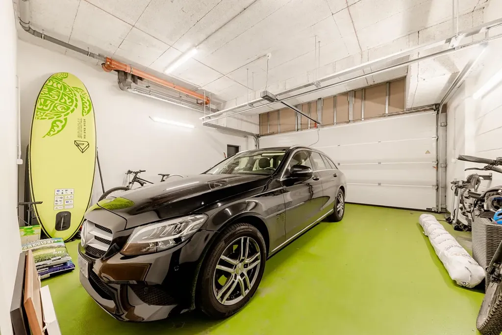 K bytu náleží uzavřené garáži o velikosti 36 m2 pro umístění dvou aut s vlastním vstupem do bytu a sklepní kóje o velikosti 13 m2.