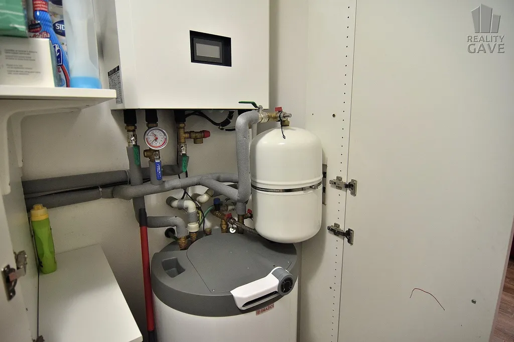 O vytápění se stará tepelné čerpadlo FUJI (v záruce), které dodává teplou vodu do podlahového topení v celém přízemí a do radiátorů v podkrovním patře. Teplou vodu připravuje elektrický bojler Dražice o objemu 120 l. Díky tepelnému čerpadlu se celkové měsíční náklady pohybují přibližně kolem 5 000 Kč (pro tříčlennou domácnost). V obývacím pokoji je navíc možné přitopit kamny; komín má nerezovou vložku a platnou revizi.
