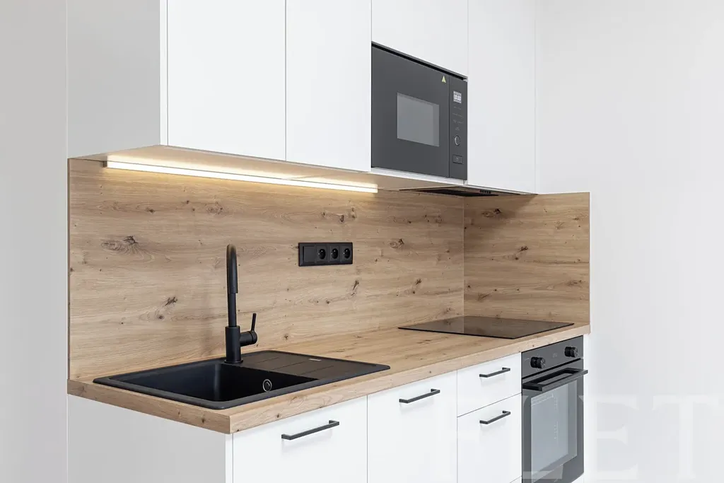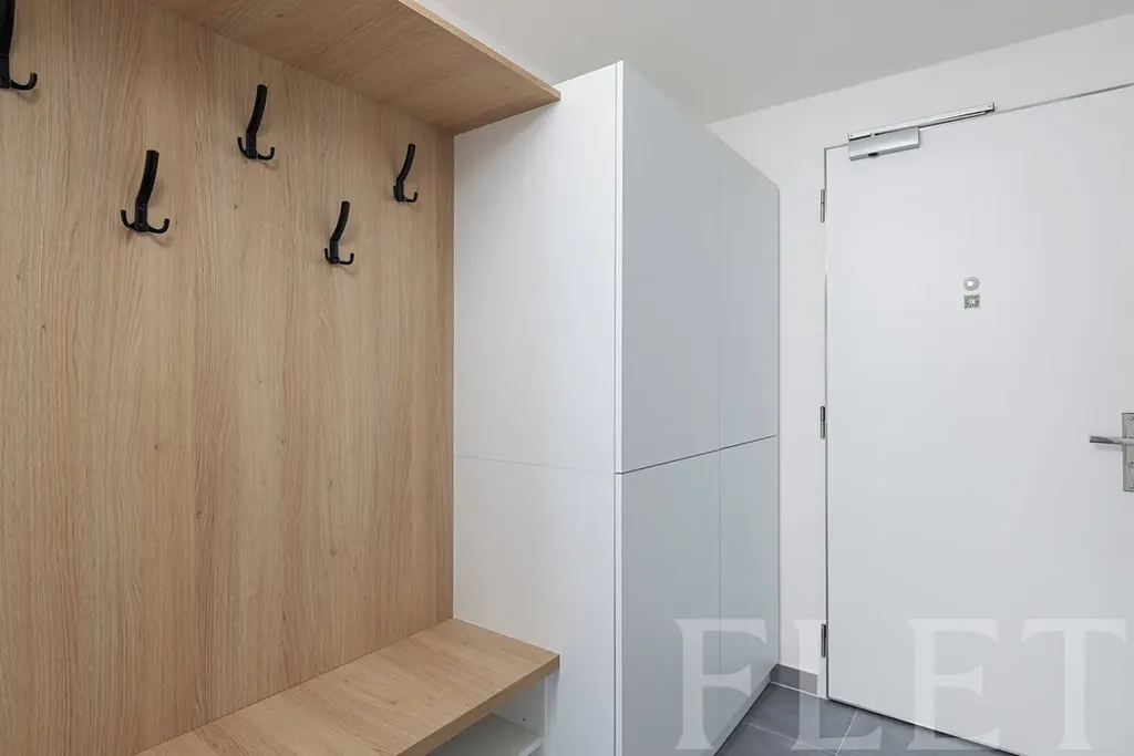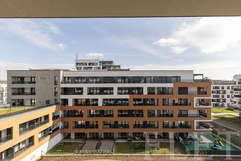 Byt je nevybavený, což vám dává možnost zařídit si jej přesně podle vlastních představ. Součástí kuchyňského koutu jsou základní spotřebiče – indukční varná deska, trouba, mikrovlnná trouba, myčka a lednice s mrazákem. Příjemné vnitřní prostředí zajišťuje rekuperační jednotka, která se stará o pravidelnou výměnu vzduchu.