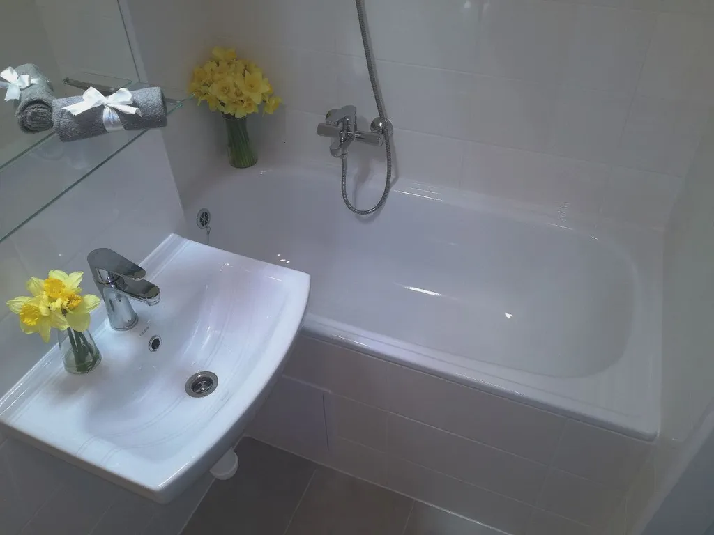 Koupelna s vanou a umyvadlem s možností připojení pračky, toaleta je součástí koupelny oddělena přepážkou.