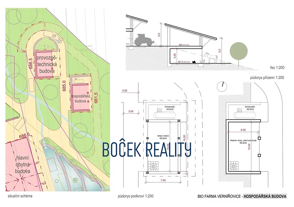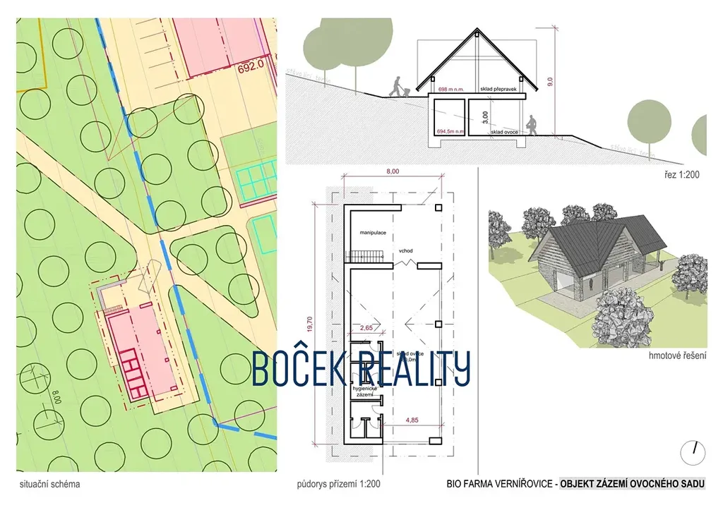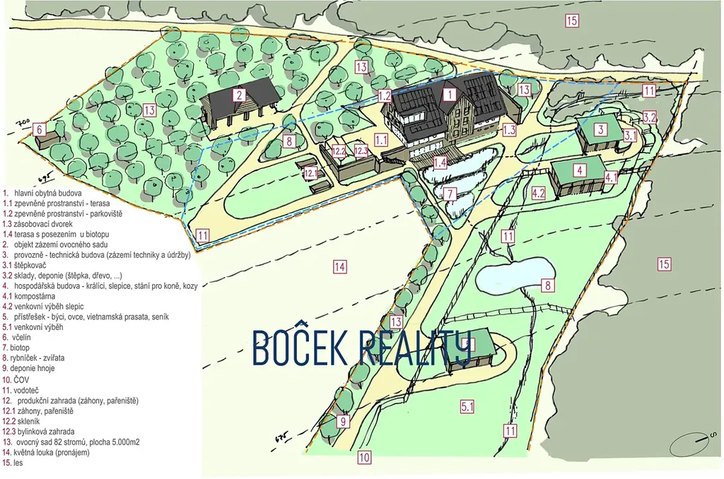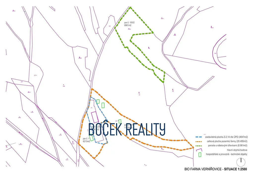 V zastoupení majitele nabízíme k prodeji lukrativní pozemky v lokalitě ochranného pásma Krkonošského národního parku o celkové výměře 34.107 m². Projekt je unikátním spojením výstavby agroturistické ekofarmy s krkonošskou přírodou v blízkosti města Žacléř. Zajímavostí tohoto projektu je, že tento projekt nemá vliv na soustavu NATURA 2000 a dále je zde vyprojektovaný hydrodynamický model, který bude schválený stavebním povolením. Tento projekt obsahuje, hlavní budovu s ubytováním, stravováním a lázeňskými službami, dále pak moderní hospodářské budovy. Nedílnou součástí farmy jsou přilehlé pozemky s plánovaným využitím pro biotop, sad, produkční zahradu, pastvu ovcí, koz, mladých býků a pro chov slepic a králíků. Stavební styl objektů farmy v sobě spojuje tradiční znaky krkonošské architektury s moderními prvky a kvalitním detailem. Farma bude postavena na základech původního domu usedlosti rozsáhlého hospodářství. Záměrem tohoto INOVAČNÍHO, UDRŽITELNÉHO a K PŘÍRODĚ ŠETRNÉMU projektu je využít genia loci již zaniklé obce Vernířovice / Wernsdorf a vyjádřit ESPRIT myšlenky autorů při tvorbě tohoto díla. Provoz objektů by měli zajišťovat moderní technologie se špičkovými provozně-ekologickými parametry doplněné o velkou pěstírnu hub, které s produkty zahrady budou využity pro účely potravinářské, kosmetické a pharmaceutické.