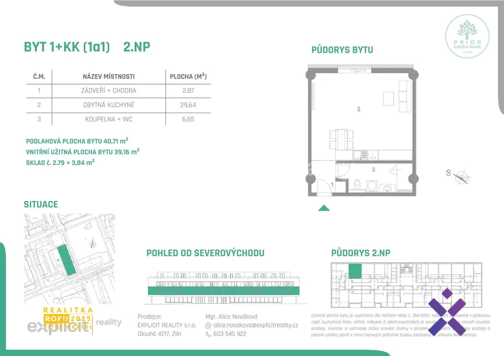 Mgr. Alice Nováková & Explicit Reality nabízí možnost výběru z 37 bytových jednotek o dispozicích 1+kk, 2+kk a 3+kk v novém polyfunkčním domě PRIOR KROMĚŘÍŽ, který vzniká citlivou rekonstrukcí ikonické budovy na Slovanském náměstí. Projekt spojuje výbornou městskou adresu s klidným bydlením. Část bytů je orientována do přilehlého parku, což zajišťuje příjemný výhled i dostatek soukromí.