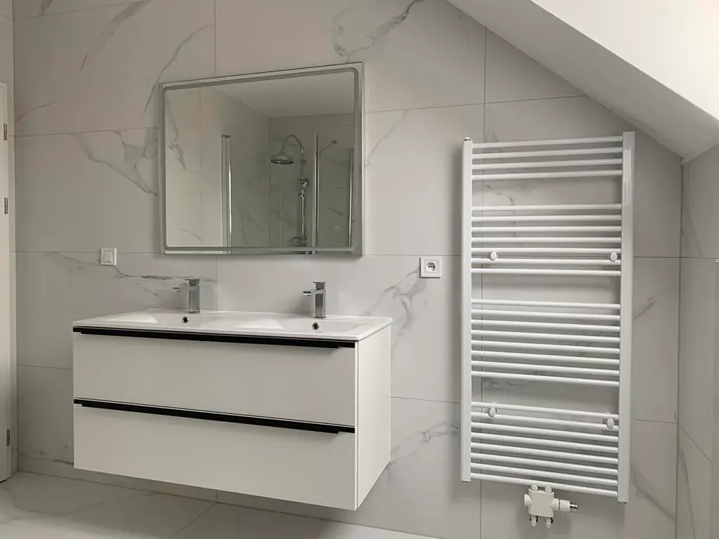 2. patro. Tady se nachází celkem 3 pokoje: ložnice, pracovna a dětský pokoj. Velká koupelna s vanou, sprchovým koutem a WC.