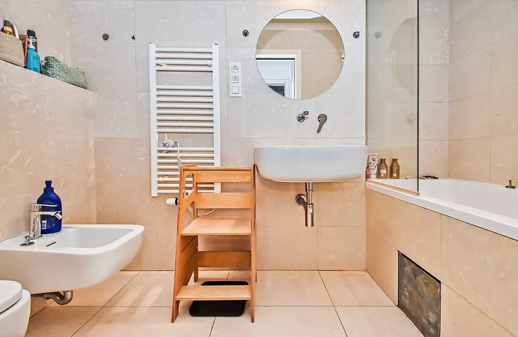 V každém pokoji je instalována klimatizace ovládaná centrální jednotkou, která zajišťuje chlazení i vytápění během celého roku. Vysoké stropy a velká panoramatická posuvná okna přivádějí do bytu dostatek denního světla a zároveň poskytují příjemný výhled do upraveného vnitrobloku plného zeleně.