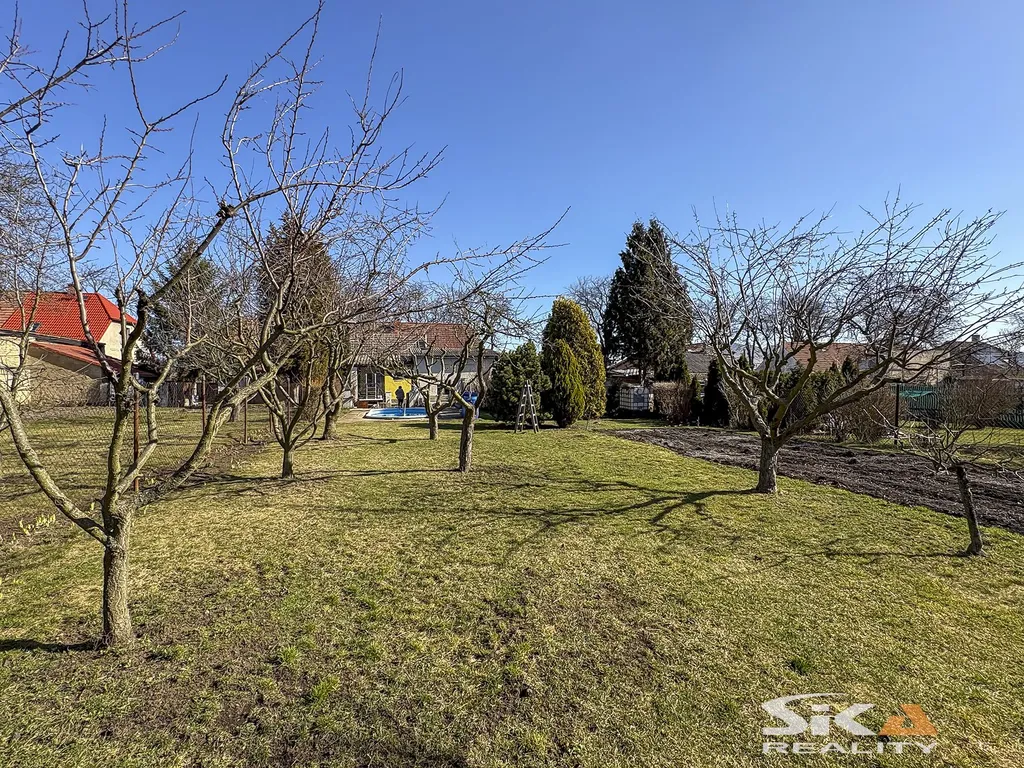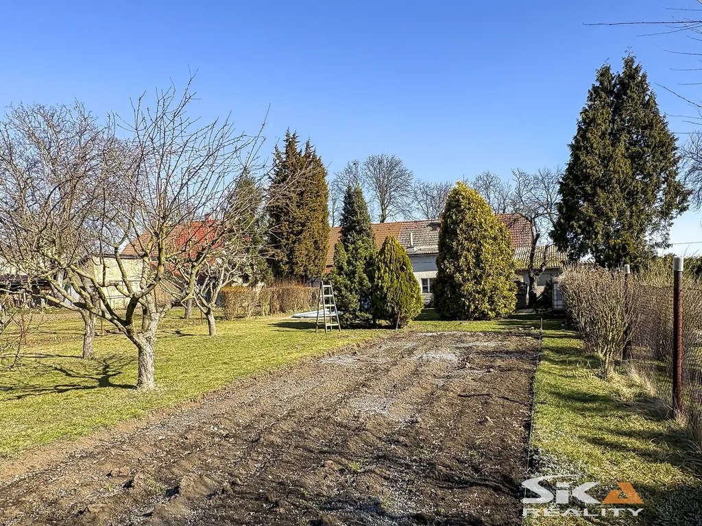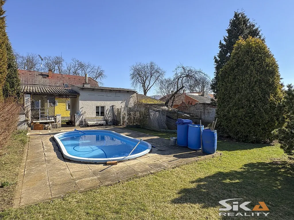 Nabízíme k prodeji polo řadový rodinný dům se zahradou o celkové výměře 817 m² v klidné okrajové části obce Břvany. Dům má jedno nadzemní podlaží, částečně upravené podkroví a je z poloviny podsklepený. Dispoziční řešení obytné části 3+1: vstup přes verandu, koupelna s WC, předsíň, kuchyně, obývací pokoj průchozí do ložnice, podkroví s pokojem a půdním prostorem. V suterénu se nachází technické a skladovací zázemí. Nemovitost prošla částečnými rekonstrukcemi (střecha, elektroinstalace, koupelna, podlahy). Vytápění je ústřední (kotel na tuhá paliva + elektrický kotel), ohřev vody bojlerem. Dům je napojen na vodovod, kanalizaci, elektřinu i plyn, k dispozici je také společná studna s užitkovou vodou. Na pozemku se nachází garáž (cca 26 m2), hospodářská stavba s letní kuchyní (26 m2) a přístřešek. Zahrada je rovinatá, oplocená, s ovocnými stromy a zapuštěným bazénem. Základní občanská vybavenost v obci, kompletní služby v nedalekých Lounech. Další informace Vám rádi sdělíme při osobní prohlídce nebo v RK. Vzhledem ke skutečnosti, že PENB se vyhotovuje, uvádíme třídu energetické náročnosti G.
