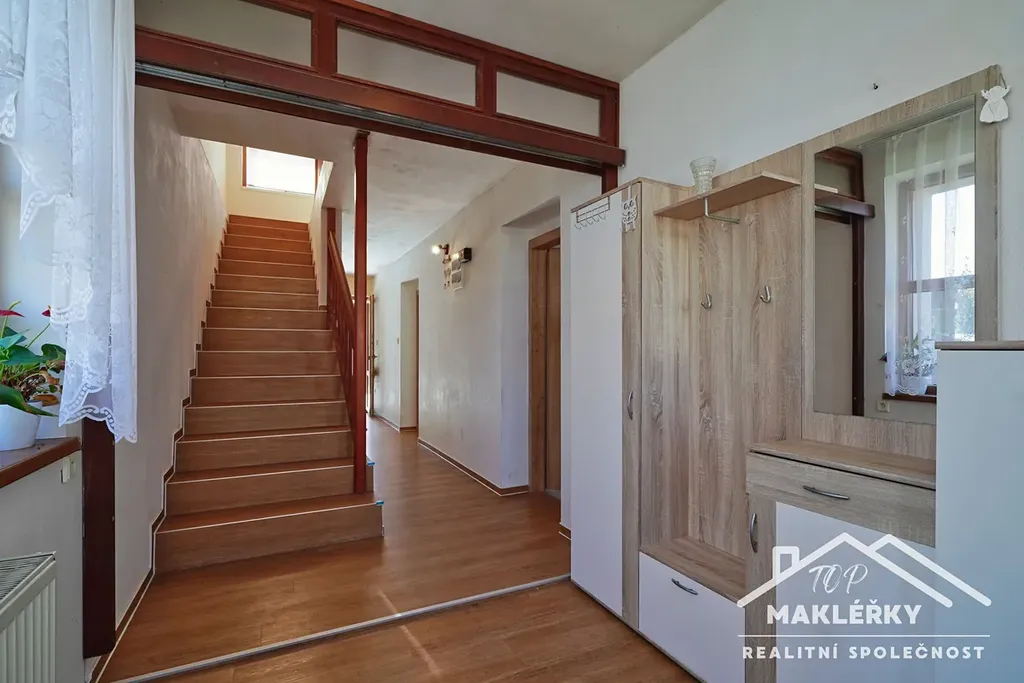 Po schodech do patra vcházíme do chodby a ta se větví do několika místností. Je zde pokoj (možné jako obývací pokoj, kde za závěsem je příprava na další kuchyňské zázemí), další dva dětské pokoje, místnost jako pracovna či cvičebna, vlevo WC a koupelna (vana, sprchový kout, topení, radiátor a umyvadlo). Ve stavbě je použito obloukových vstupů mezi místnostmi.