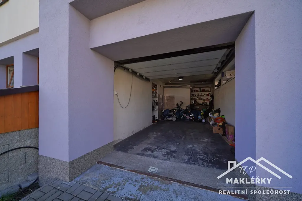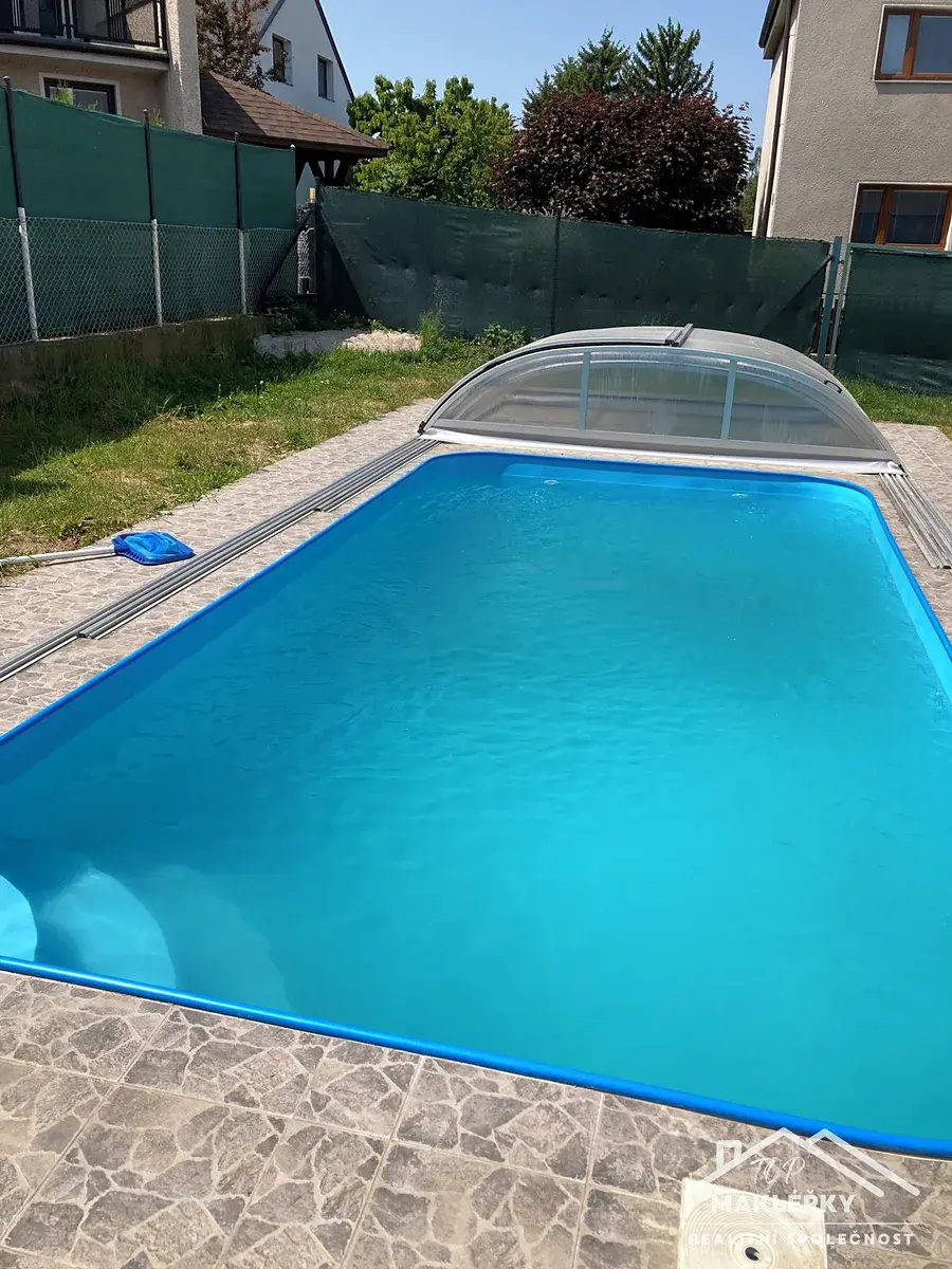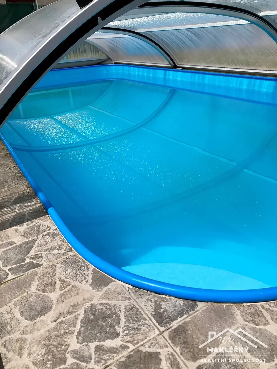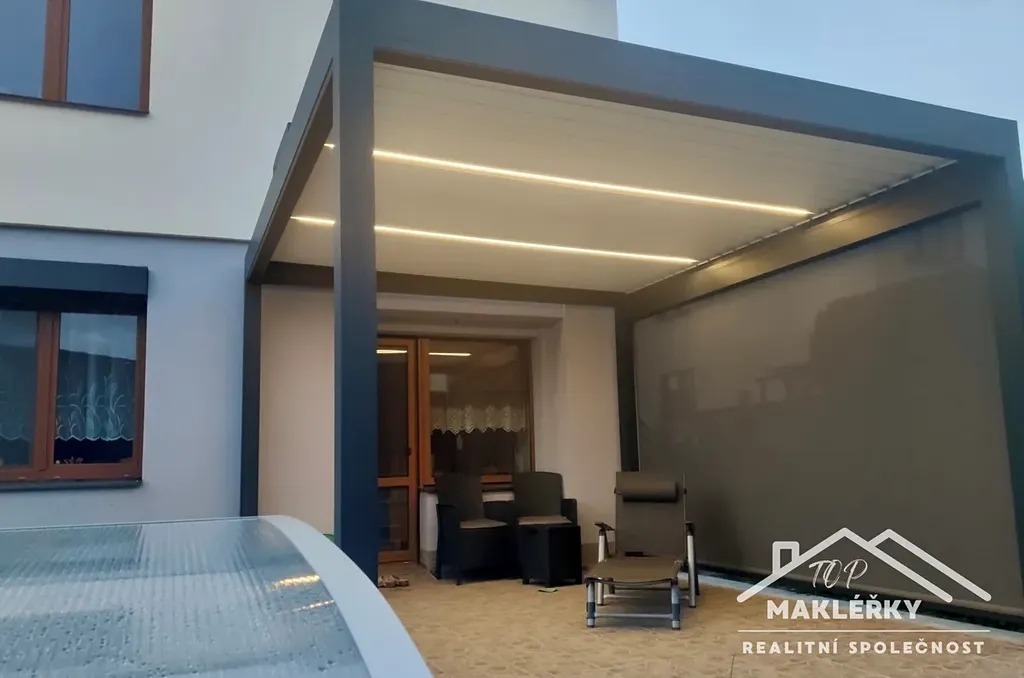 V zadní části u domu je hliníková pergola s otočnými lamelami (jednu stranu lze zastínit stahovací přepážkou) a bazén 3x6m. Střecha rovná, plechová. Do garáže je vstup pouze zvenčí.