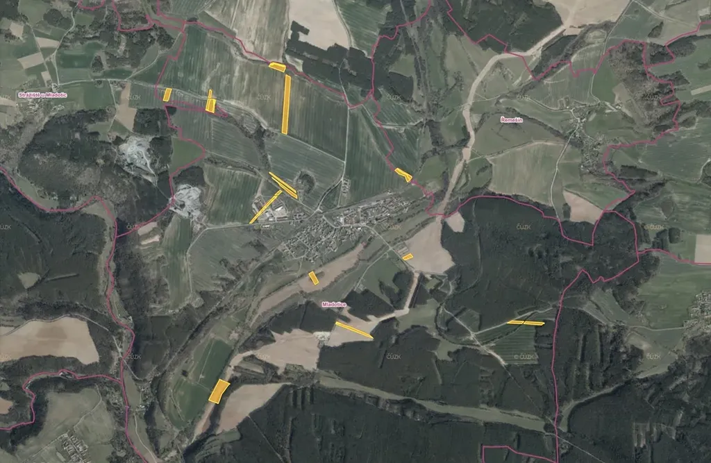 Pozemky o podílové výměře 37 649 m², vedené na LV 686 (o podílu 1/2), parcelní čísla: 126/3, 164/5, 165/3, 166/1, 242/1, 64, 76/7, 131/3, 132, 137/8, 161/74, 241, 276, 277, 280, 284, 285, 286, 400/20, 400/29, 447, 474/10, 1005/56, 1005/67, 1174/5, 1176, 1455/1, 1455/2, 1514, 1604/3, 1645/19, 1645/20.