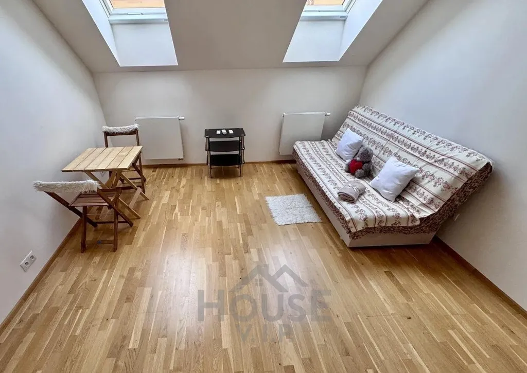 K dispozici je klimatizace, rozkládací gauč, kuchyňská linka včetně mikrovlné trouby Whirpool, lednice Electrolux, 2-plotýnková sklokeramická varná deska a digestoř. Koupelna je vybavena sprchovým koutem, toaletou a pračkou. Díky střešním oknům je byt příjemně světlý a vzdušný. Podlahy jsou plovoucí, v koupelně dlažba.